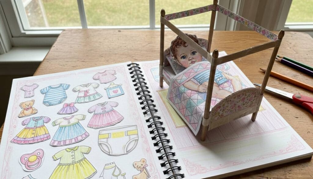 Assim como faço com meus bebês de silicone, a graça do reborn de papel está na rotina. Você pode criar um “berço” dentro de um caderno ou caixa de sapatos.