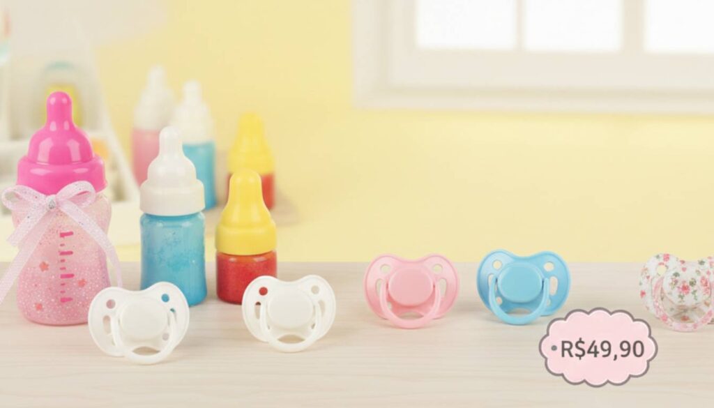 Outro item muito querido são as mamadeiras reborn e chupetas para Bebê Reborn. Por valores acessíveis, você encontra: