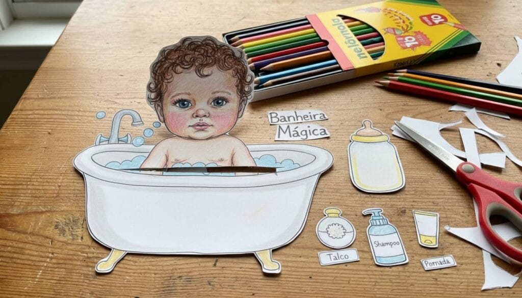 - Banheira de Papel: Desenhe uma banheira e recorte uma fenda para “encaixar” o bebê dentro, simulando o banho.