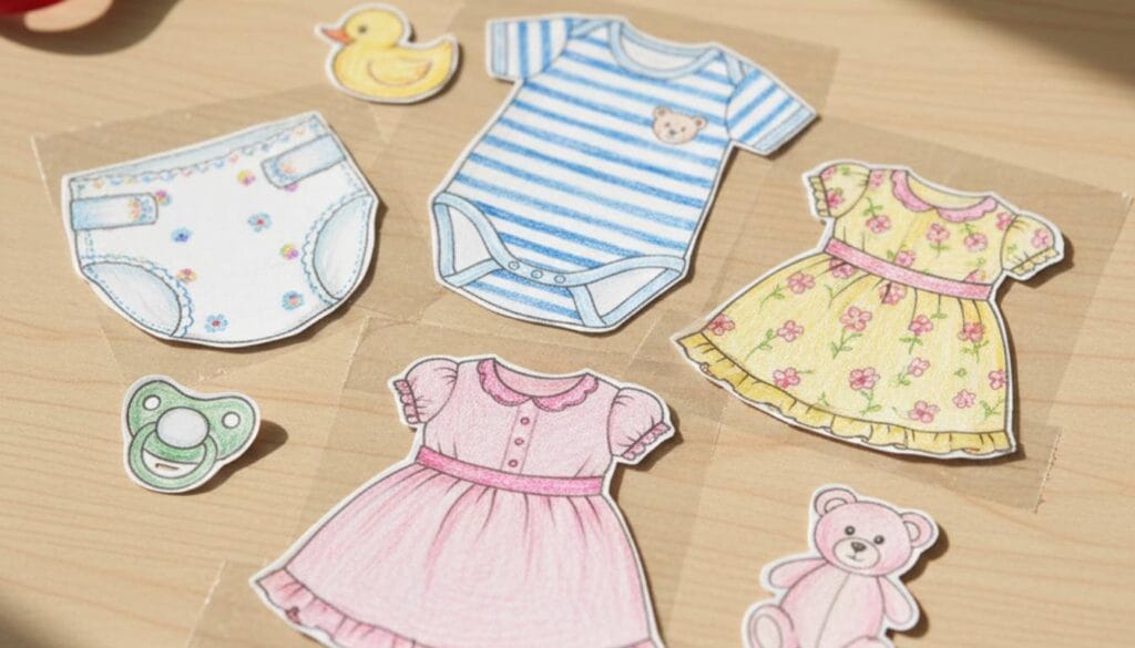 - Criação do Enxoval: Agora use o corpo do bebê como base para desenhar fraldas, bodies, chupetas e toucas. Lembre-se de deixar as “abas” de papel ou usar a fita dupla face para prender as roupas.