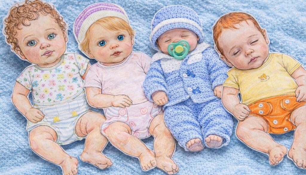 O Bebê Reborn de Papel nada mais é do que uma evolução moderna das Paper Dolls. A grande diferença está no estilo: os desenhos buscam traços mais fofos e semelhantes a bebês de verdade, com dobrinhas, sombreamento e expressões faciais.