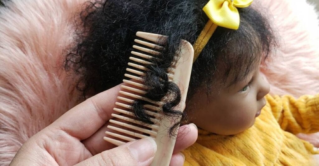 - Não penteie seco: Nunca passe escova no cabelo afro do seu reborn quando ele estiver totalmente seco, pois isso causará frizz e desmanchará os cachos.