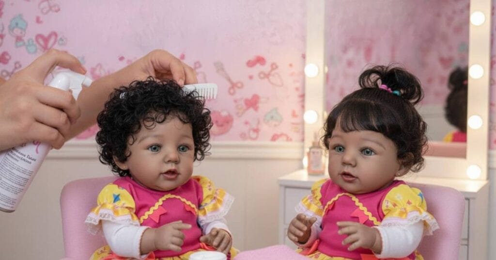 O cabelo de boneca realista com curvatura tende a embaraçar mais facilmente se não for manipulado corretamente. O segredo não está na força, mas na escolha dos produtos e na forma de “selar” a umidade na fibra. Quando falamos de cabelo afro em bebês reborn, estamos lidando com uma estética que valoriza o volume e a forma, e para manter isso, a hidratação deve ser constante.