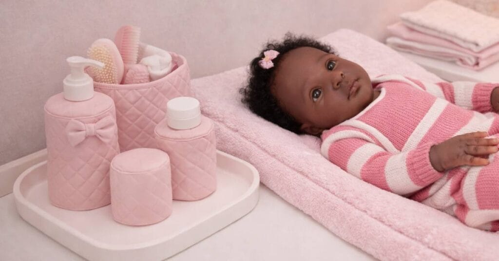 Muitas colecionadoras gostam de criar um mini berçário completo, com berço, trocador, guarda-roupa, prateleiras e diversos acessórios que imitam um quarto de bebê real. Além de deixar tudo organizado, a decoração ajuda a valorizar o realismo da boneca e cria um cenário perfeito para fotos e vídeos.