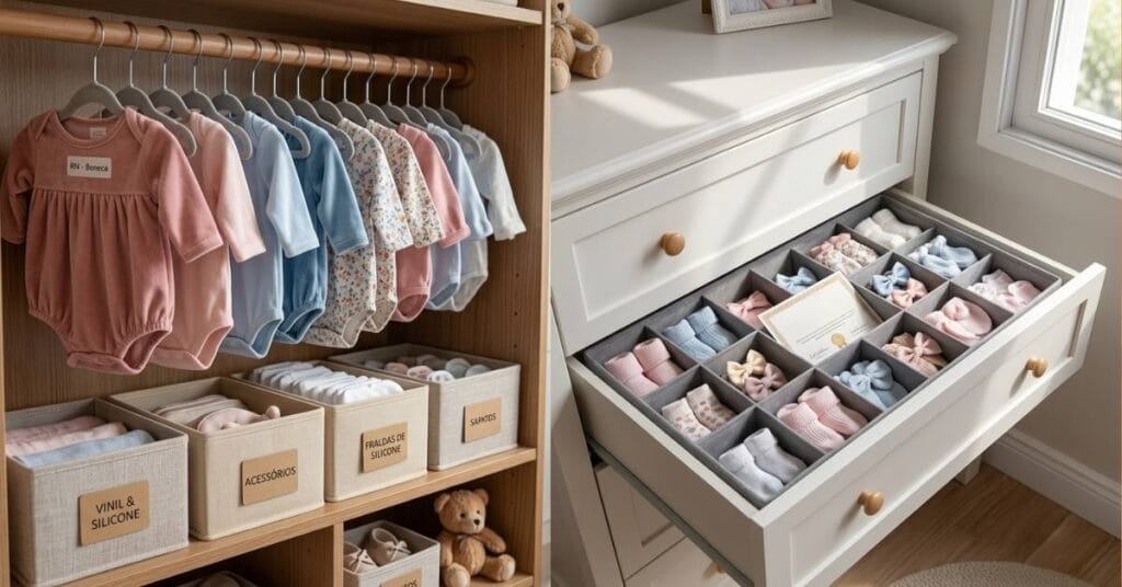 - Caixas Organizadoras: Para o enxoval que não está em uso (como roupas de outra estação), utilize caixas de tecido que permitem que as peças “respirem”, evitando o cheiro de guardado.