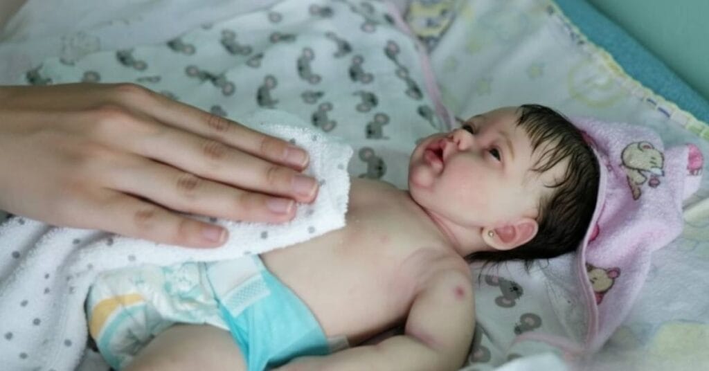 - A Secagem: Enrolar o bebê na toalha com todo cuidado.