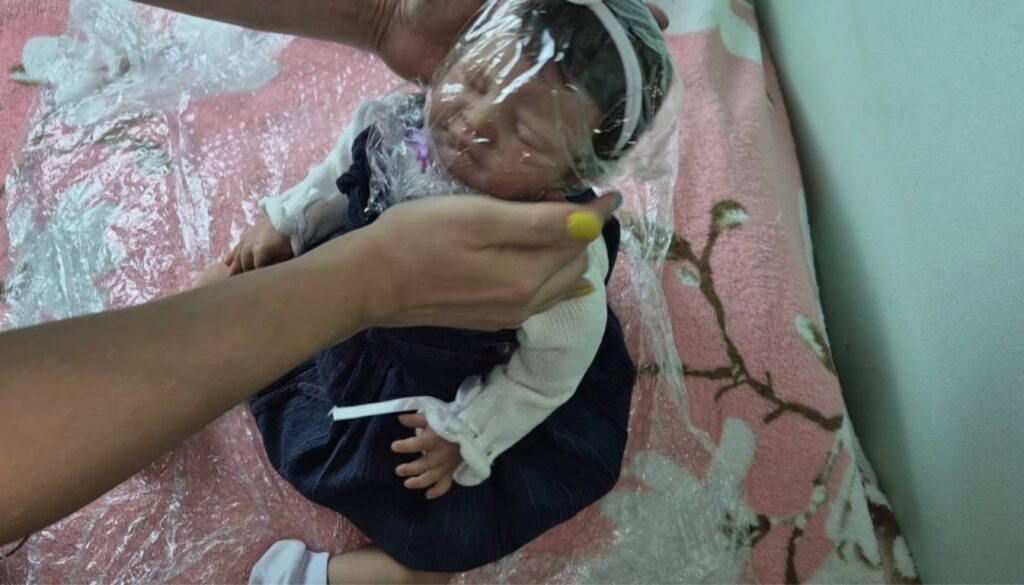 Ao revelar o rosto da bebê, é possível notar como a técnica reborn evoluiu. A Gláucia possui um cabelinho em mohair bem fininho, que tem a textura exata de um cabelo humano de recém-nascido. A pintura da pele inclui as famosas “manchinhas de frio”, unhas com francesinha natural e um peso distribuído que faz com que ela se acomode perfeitamente no colo.