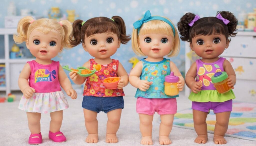 2. Baby Alive Hora do Xixi: Uma das versões mais acessíveis. O foco é a ingestão de água pela mamadeira e a troca imediata da fraldinha.