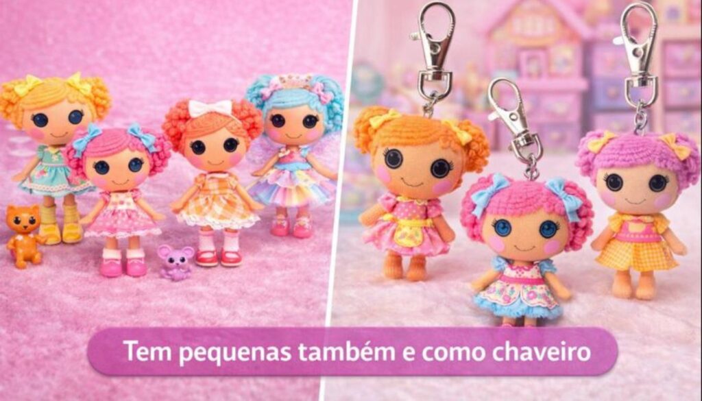 Além das bonecas tradicionais, a linha Lalaloopsy conta com versões miniaturas e até modelos em formato de chaveiro, perfeitos para quem gosta de colecionar ou levar suas personagens favoritas para qualquer lugar.