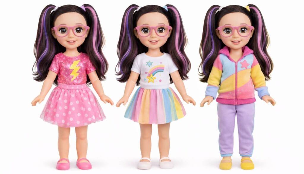 Algumas versões acompanham roupas extras ou pequenos acessórios.