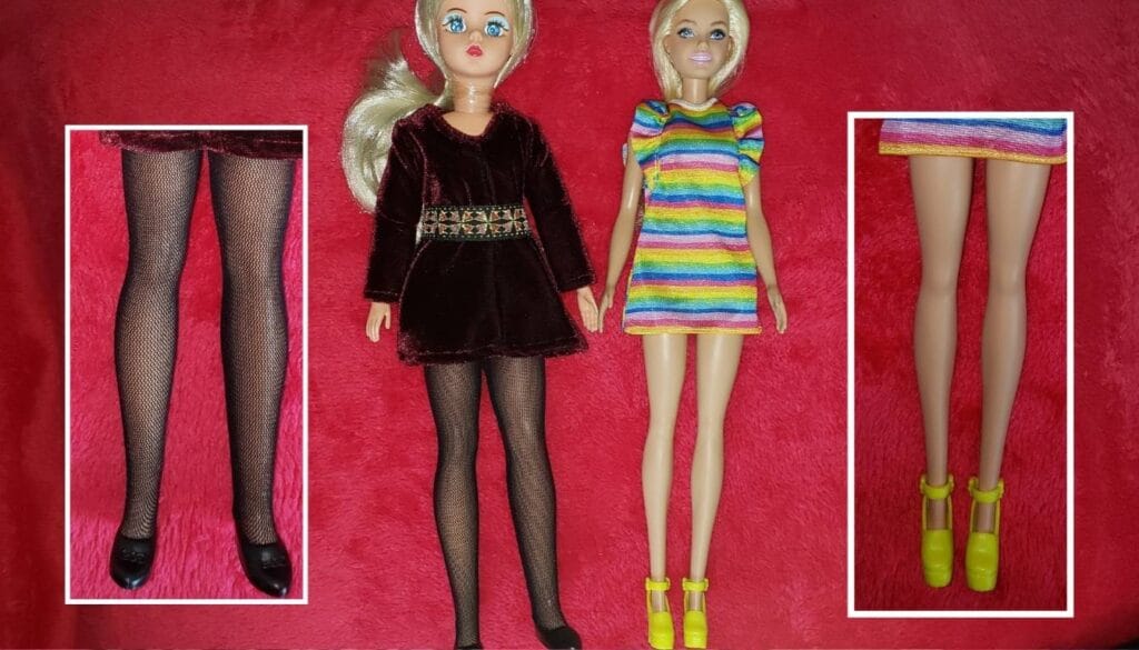 Por outro lado, a Susi (que tem 28 cm) é conhecida por ter proporções mais realistas. Suas pernas são visivelmente mais grossas, e o formato do corpo é mais curvilíneo, lembrando o biotipo das mulheres brasileiras. No vídeo, mostrei como as pernas da Susi antiga são bem diferentes das Barbies atuais, especialmente as da linha Fashionista.